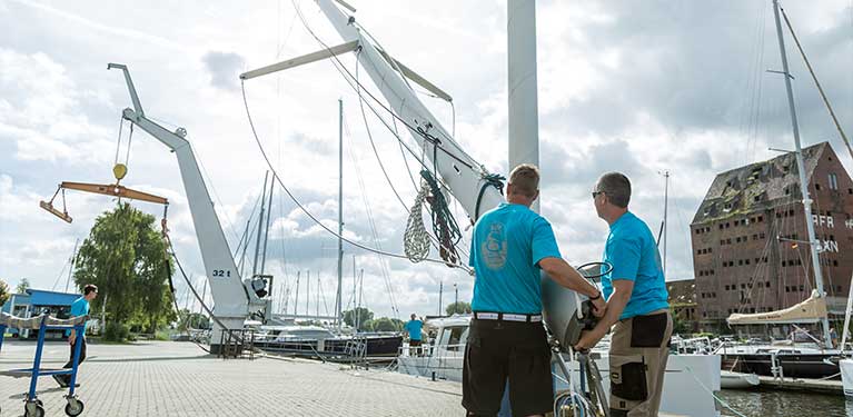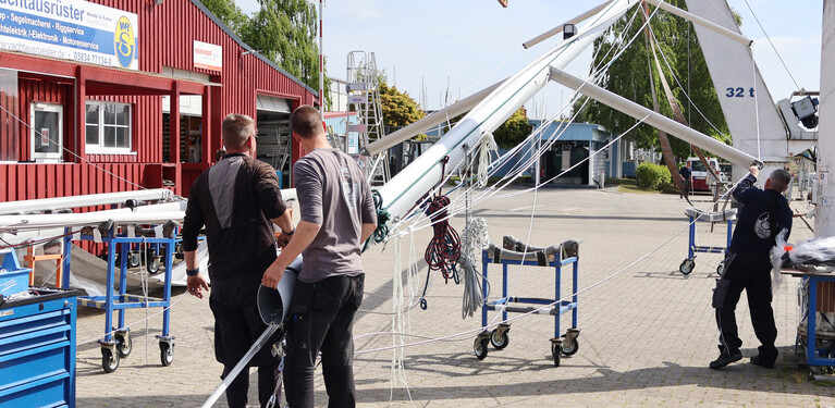 Our mast-building workshop with its own mast crane directly on the Ryck offers the ideal conditions for a comprehensive rigging service. Our specialised staff rig and de-rig around 800 sailing yachts a year. The production of new shrouds and stays as well as the production and splicing of running rigging is just as much a part of our range of services as the production, assembly and repair of furling systems, masts and booms, for example. We are also happy to develop customised solutions for special requests.
